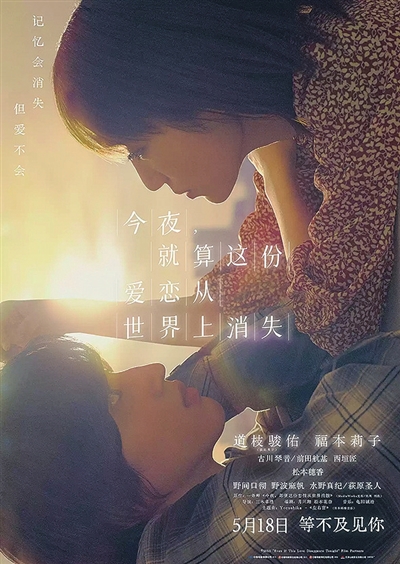 5月18日,《今夜,就算这份爱恋从世界上消失》《四月女友》同时开映,同样都是日本爱情影片。由三木孝浩执导,道枝骏佑、福本莉子主演的《今夜,就算这份爱恋从世界上消失》,影片讲述日野真织找到神谷透,提出要和他假扮情侣,并与他约定了假扮情侣的三个条件,一段甜蜜又浪漫的约会之旅就此展开。两人在相处过程中逐渐爱上对方并相互治愈,成为了彼此生命中最重要的人。