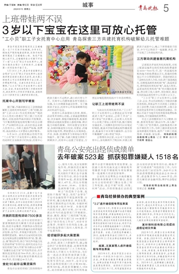 市总工会将继续加大与卫健委、妇联、教育局等部门联动合作,深入推广“三联三化”托育模式,创新推进用人单位开展托育工作,为职工提供更加优质高效普惠托育服务,提升广大职工的获得感、幸福感、安全感。 观海新闻/青岛晚报/掌上青岛 记者 李沛 通讯员 宁莉琴 殷世山
