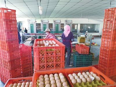 陈锡佐在生产线上查看鸡蛋质量。马丙政 摄
