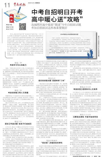 明天,2024年青岛中考“自招时间”就将开启。5月17日,局属公办普通高中自主招生统一笔试将在各所初中举行;18日,公布笔试位次成绩和面试资格线;19日,局属普通高中组织入围本校自招面试的考生参加自主招生测试面试。当前自招政策下,由于笔试是统一命题,自招面试环节就成为各所高中“自由发挥”的唯一机会,各校更愿意选拔与学校育人理念更为接近的学生。而对于报考自主招生的初三学子们来说,这是人生第一次参加与升学相关的面试。自招面试考什么?需要注意什么?有什么面试技巧?这些都是很多考生和家长关心的问题。日前,记者独家采访了岛城部分高中,收集并总结了部分学校的“自招面试攻略”,期冀助力考生们顺利备考。另外,为了释放考生的紧张情绪,青岛三中和青岛九中还提前公布了一道开放性很强的自招面试题。