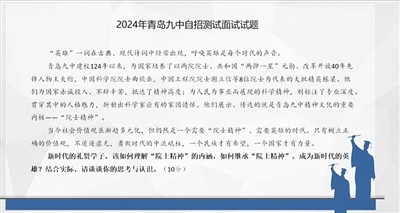记者看到,青岛三中2024年自主招生面试题目(一)为给出一段文字和视频材料,要求考生结合给出的文字和视频材料,谈谈对阅读重要性的认识以及认为影响自己阅读能力提升的因素有哪些?今后,打算如何提升自己的阅读水平?