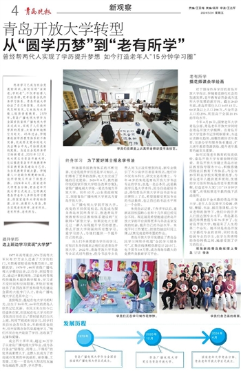终身学习已成为社会发展的共识,如何实现“活到老,学到老”,不仅考验着人们的自律,更考验着全民终身学习体系。青岛开放大学给出了自己的答案。无论时代怎样变化,它永远为大多数人提供普惠教育。1979年,青岛广播电视大学作为全国首批省级广播电视大学正式成立,实现了人们提升学历的愿望,大家亲切地称它为电大。45年过去,伴随着我国学历教育体系的不断完善,完成历史使命的电大淡出舞台中央,开始谋求新的发展。为适应全民终身学习的新需求,2020年12月,电大更名为青岛开放大学,它以推进青岛市开放教育和社区教育体系建设为己任,为全民教育贡献力量。伴随着人口老龄化程度的加深,这所学校又开启了转型之路。2024年4月,国家老年大学青岛分部、青岛老年开放大学正式成立,它将满足青岛市老年人多样化学习需求,将国家老年大学好的资源、活动、政策引入青岛,努力实现老有所学、老有所乐、老有所养、老有所为。