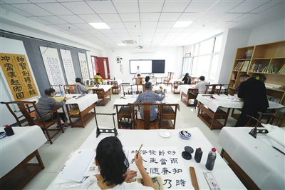 学员们在课堂上认真听老师讲授书法技艺。