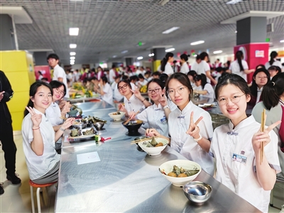 清晨,高三学子们早早来到图书馆孔子像下,在签名墙上郑重地签下自己的名字,也留下对未来生活的美好愿望。每年的这一天,粽子加鸡蛋的早餐标配是实高专属的仪式感。高一、高二学生和老师们提前亲手包制了粽子,为高三学子送上美好的祝愿。高三学子们品尝着香甜软糯的粽子,开心地合影留念,缓解高考备战的紧张情绪。“五色新丝缠角粽,浓情蜜粽送祝福。”据学校老师介绍,粽子撷取“粽”与“中”的谐音,寓意“金榜高中”,包裹着师生们对高三毕业生的祝福与期待。