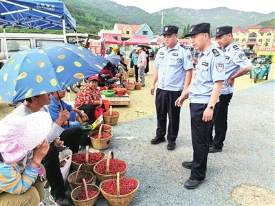 民警叮嘱售卖樱桃的农户要注意看好电子秤上的读数。刘卓毅 摄