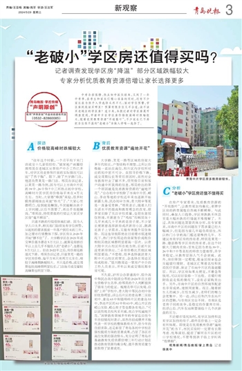 大学路、莱芜一路等区域的房屋大多年代较长,户型结构不理想,之所以价格能一直站在高位,和片区内学校所对应的初中密不可分。在探寻价格下跌、成交周期拉长等背后原因时,虽然对全市教育行业了解不多,但凭借日常和客户沟通中所获得的信息,邢昊给出的第一个原因就是优质教育资源的“遍地开花”。“公办初中学校除了市南中片区,崂山、李沧等地的学校近年来也逐渐开始崭露头角,民办初中方面,青大附中等更是一直备受青睐。”邢昊表示,随着人们生活水平的提高和教育观念的改变,很多家长除了关注学校质量,也很在意居住环境,不愿意为了“鸡娃”而蜗居在十几平米或几十平米的老房子里,不少家长更愿意选择新房或次新房小区,既满足孩子上学需求,又能有效提升居住体验。而这也导致即使在目前楼市低迷情况下,热门学校周边的房屋售价或租价相较其他区域都明显要高一层次。以青大附中天山校区所在地为例,目前片区没有新房供应,二手房价格比其他区域明显要高。“不愁租,很多选择就读青大附中天山校区的家长,会选择在周边买房或租房。”银川路周边一家房产中介的工作人员表示,开年以来成交情况都非常可观。