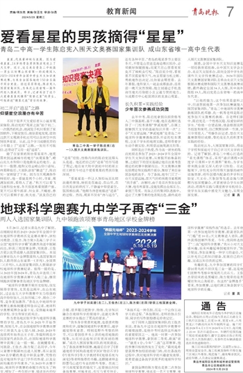 5月28日,记者从青岛九中了解到,在刚刚结束的2023-2024学年全国中学生地球科学奥林匹克竞赛决赛中,该校刘奕澄、王俊杰、陈方粲3名高二学子从全国“地球科学学霸”的激烈角逐中脱颖而出,斩获三枚国赛金牌,刘奕澄、王俊杰更以优异成绩入选国家集训队。本届决赛青岛九中金牌数量和入选国家集训队人数均居山东省第一(并列)、全国第二(并列),入选国家集训队人数刷新学校地球科学奥赛纪录。值得一提的是,从2022年到2024年,青岛九中连续三年在地球科学奥赛决赛中入账三金,继续领跑该项赛事青岛地区学校金牌榜。