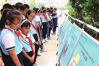 在50块普法展板前,学生们阅读着自己喜欢的法律故事。普法展板内容涵盖《中华人民共和国预防未成年人犯罪法》条文图片巡展、中国法律历史人物和故事巡展、“身边的法律故事”巡展、中国宪法发展史巡展、榜样的力量巡展,共五大板块,既能让学生直观看到图文并茂的普法内容,又能直接感受到法律的广泛性和严肃性。