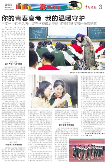 平度一中的特别,不仅仅在于它庞大的考点规模。高考倒计时两天,当市区大多数高中上完高三“最后一课”,学生拖着行李返家的时候,在平度一中,998名高三学子仍在教室里争分夺秒地复习。因为许多学生的家不在平度市区,为了方便这些学生复习备考,高考前最后一周,高三所有老师继续陪伴学生留在校园一“战”到底。今年,该校近千名高三学生中,三分之二选择在高考前最后一周住在学校,其他不住校的学生,也将在学校自习室“奋战”到考前最后一夜。