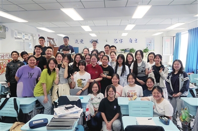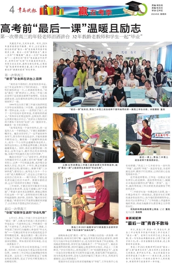 “最后一课”结束后,青岛二中高三政治老师于惠和她带的第一届高三学生合影。本版摄影 董真