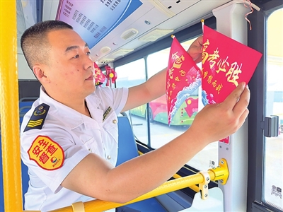 公交301路驾驶员杨涛以“高考——旗开得胜 梦想成真”为主题,精心布置十米车厢,为考生送上诚挚祝福。今年,我市将开通1路、2路、212路、302路、609路、610路等六条“高考学生专车”。1路高考专车将分别在7日早晨7时40分和9日、10日早晨6时40分自四方宣化路始发站发出,沿途接送旅游学校考点的考生及家长。专车前风挡玻璃下方设置了醒目标识牌,方便学生及家长辨认。志愿者将全程提供随车服务,应对处理各类突发情况。