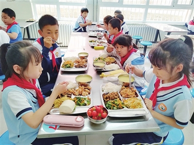 市北区实验小学学生享受美味营养午餐。