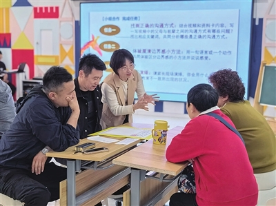 市北区海安幼儿园教师郑晶(左三)为家长讲家教亲子课。