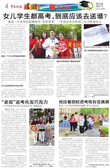“加油!相信自己一定可以。”6月7日上午7时30分,青岛一中高三班主任尚妮娜和同事们早早守候在青岛一中考点外,面对即将走进考场的学生,尚妮娜都会送上一个大大的拥抱。这已经是尚妮娜第十次参加高考送考,但这一次,她的心中又多了一份牵挂——尚妮娜的女儿也要走进高考考场。既要把每位学生顺顺利利送进考场,又要让女儿安心考试。这对于尚妮娜来说是个不小的考验,她甚至制作了一份日程表,哪个时间段送考学生,哪个时间段接孩子,甚至要买哪些菜,都事无巨细地在表格中写明。A4纸大小的表格里,是一位人民教师高度的责任心,更蕴藏着一位母亲对孩子深深的爱。