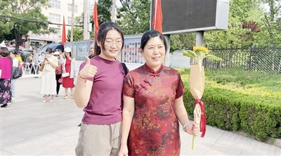 考场外,不少妈妈身着旗袍,寓意“旗开得胜”,给参加高考的孩子加油。“这两个月忙着做旗袍,孩子考试前一天才给自己量身定做了一身,现在穿着来助威。”是考生家长也是裁缝的赵女士与记者分享。