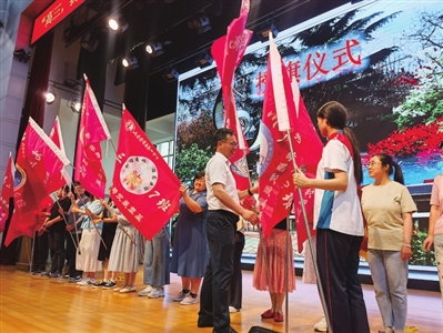 在授旗仪式上,校长严贤付将代表“信任和期待”的班旗交到各班班主任手中,随后,14个班的班主任分别为班级授旗,各班级代表接受象征胜利和成功的旗帜。