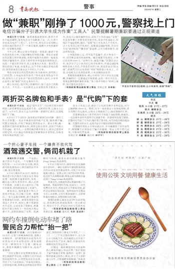 本报6月17日讯 眼看暑假就要到来,很多大学生开始找兼职,有些电诈分子也瞅准了这一点,引诱大学生成为电诈“工具人”。6月中旬,青岛市公安局崂山分局办案民警讲述了一个真实案例,提醒大学生找兼职时一定要擦亮双眼。