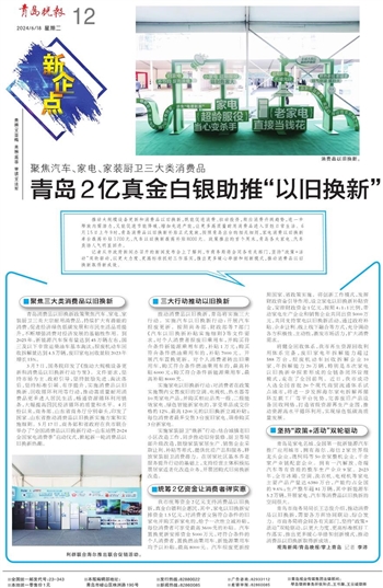 推动大规模设备更新和消费品以旧换新,既能促进消费、拉动投资,顺应消费升级趋势,进一步释放内需潜力,又能促进节能降碳、增加先进产能,让更多高质量耐用消费品进入百姓日常生活。6月15日上午9时,青岛消费品以旧换新补贴正式发放,按照青岛出台的相关细则,家电消费以旧换新单台最高补贴1200元,汽车以旧换新最高补贴8000元。政策推出的首个周末,青岛各大家电、汽车卖场人气明显回升。