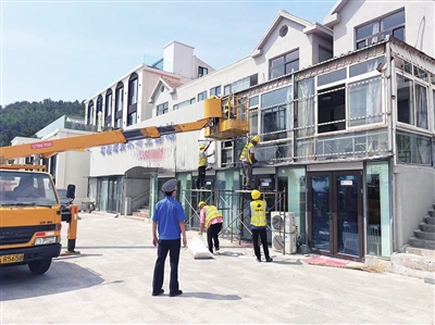 6月13日上午9点,王哥庄街道峰山执法中队组织对曲家庄村景区专用路旁一商户的遮窗招牌进行拆除。该商户经营写生培训业务,人员较为密集,违规广告牌既影响景区观瞻,又将商户二层窗户遮挡得严严实实,如果发生火灾等意外事故,将严重影响到应急逃生。执法人员采取“一商量、二警告、三拆除”的工作措施,向商户讲透法律法规存在的安全隐患,并制定安全可行的解决方案。这是今年峰山中队拆除最大的一块违规户外广告牌,面积达70余平方米。