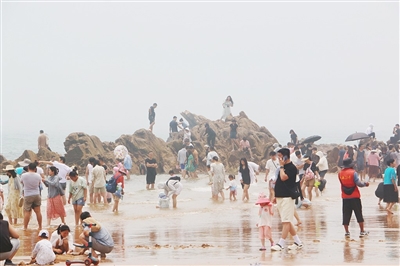 在青岛金沙滩海水浴场,游客享受海边清凉。梁超 摄