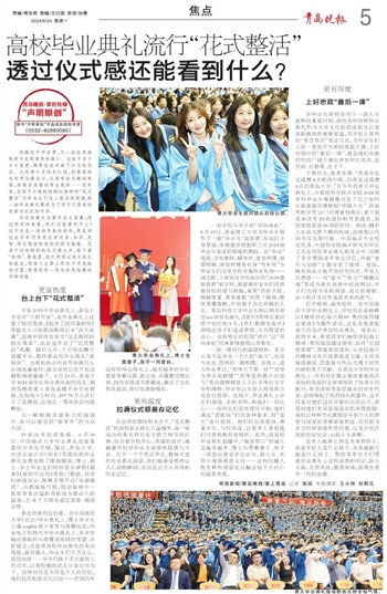 弥足珍贵的自信感。在中国地质大学(北京)毕业典礼上,博士毕业生小潘cosplay派大星参与拨穗仪式;西安电子科技大学毕业典礼上,有学生掏出香槟杯与拨穗老师同饮雪碧、合影留念;在驻青高校毕业典礼的采访现场,面对镜头,毕业生们大方比心,侃侃而谈……学子们敢于不在意别人的目光,以更松弛的状态从容应对当下。这种自信还不仅是个人的自信,他们也在彰显文化自信——在国内外高校的毕业典礼上,越来越多的学生愿意身着汉服、披云肩、头戴簪花帽出席,国风穿搭成为新潮流,激活了文化传承基因,常引发满场喝彩。