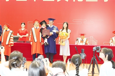 青大毕业典礼上,博士生携妻子、孩子一同登台。