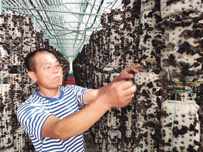 西马丘村村党支部书记陈礼善查看黑木耳长势。