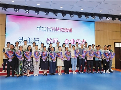 本报6月28日讯 28日下午,青岛经济职业学校举行“润玉致美 闪耀未来”2024届毕业典礼。530名毕业生同上“最后一课”,回忆三年成长,学生忘不了慈母严父般的深深师恩、忘不了情同手足般的纯真友情、忘不了企业师傅的谆谆教导……现场,学生代表手捧寓意感恩的鲜花,走上讲台向班主任、教师代表、企业代表献花,一束一束鲜花承载着学子们感恩的心,为敬爱的老师送去最诚挚的敬意。