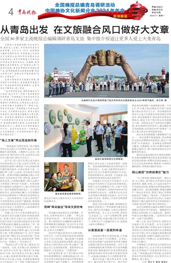 从新闻人的角度观察“活力海洋之都、精彩宜人之城”,书写新时代青岛文旅新形象。6月27日-29日,全国晚报总编青岛调研活动·中国晚报工作者协会文化新闻分会2024年年会暨会长会议在青举办,来自中国晚报工作者协会30多家会员单位的社长、总编辑、资深编辑记者齐聚青岛,从“夜游浮山湾”文旅项目起航,看青岛啤酒如何弄潮文旅产业,在啤酒城联动全国媒体直播“青岛与世界干杯”,登崂山华严景区感受“自然人文两相宜”……