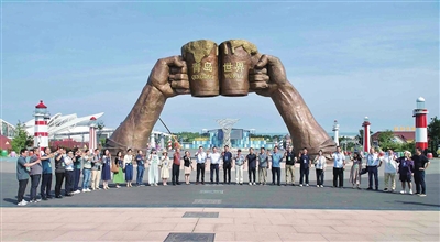 总编辑们在金沙滩啤酒城门前共同举杯向全国游客发出2024啤酒节邀约。栾丕炜 摄