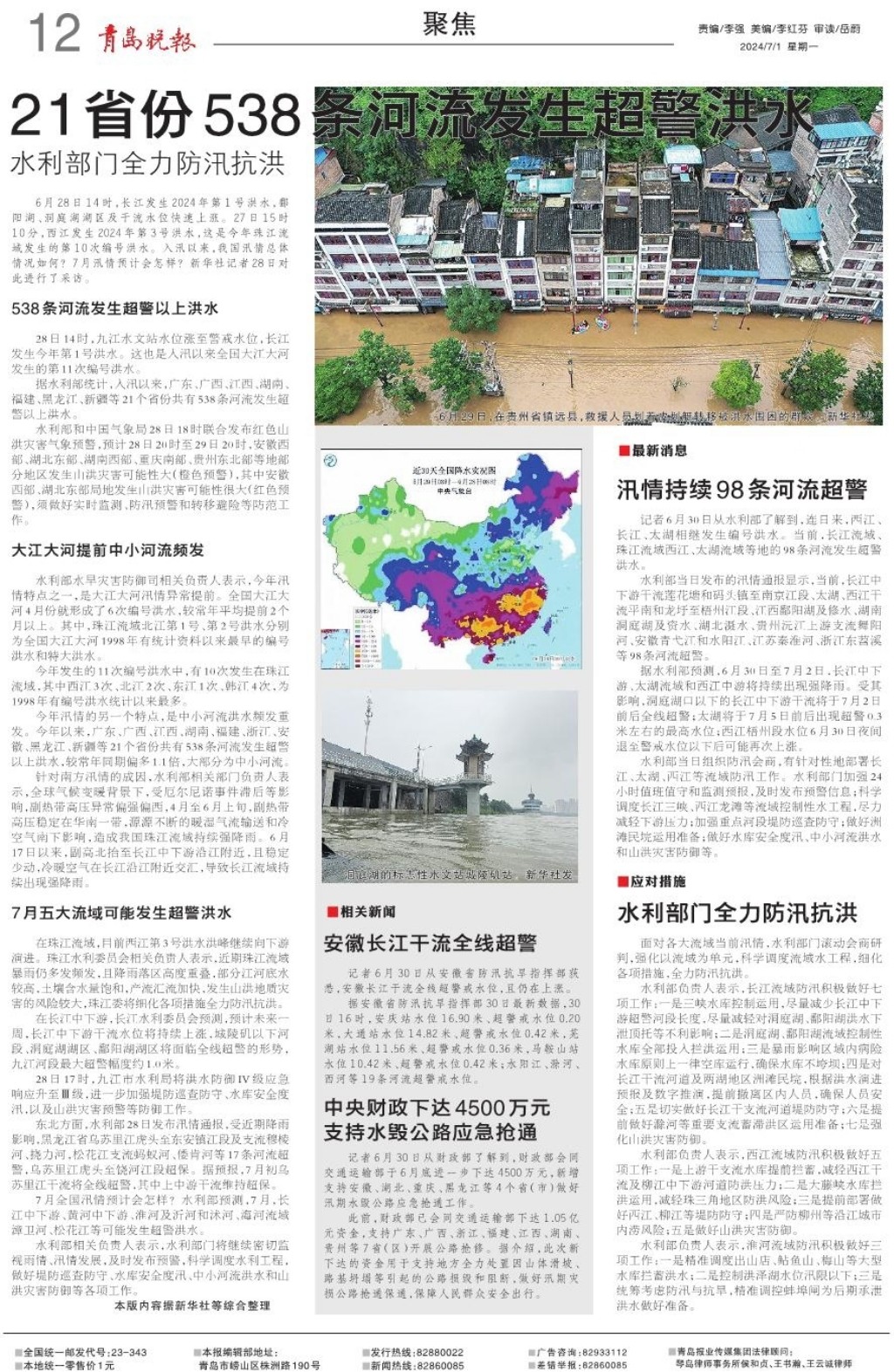据水利部统计,入汛以来,广东、广西、江西、湖南、福建、黑龙江、新疆等21个省份共有538条河流发生超警以上洪水。