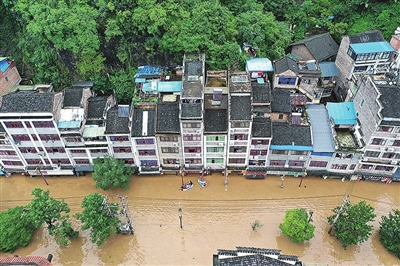 6月29日,在贵州省镇远县,救援人员划着皮划艇转移被洪水围困的群众。新华社发