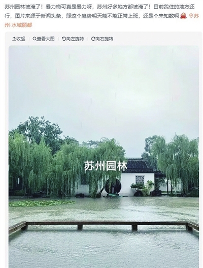 6月30日,有多位网友发图称,由于暴雨导致苏州园林内步道被水淹没。从图中可以看到,苏州园林内湖水漫至观景平台及台阶。