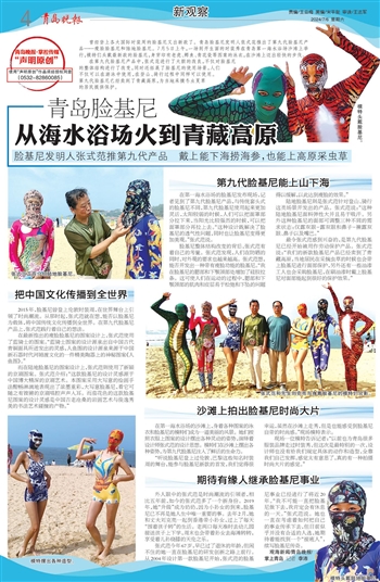 在第一海水浴场的脸基尼发布现场,记者见到了第九代脸基尼产品,与传统套头式的脸基尼不同,第九代脸基尼使用起来更加灵活,太阳较弱的时候,人们可以把面罩部分拉下来,当阳光比较强烈的时候,可以把面罩部分再拉上去。“这种设计既解决了脸基尼的透气性问题,同时也让脸基尼变得更加美观。”张式范说。