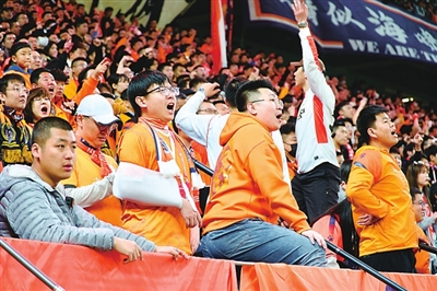 首场中超“青岛德比”,西海岸队球迷现场助威。