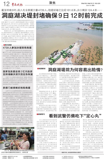 记者从7日下午召开的湖南省政府新闻发布会上获悉,截至7日16时许,团洲垸洞庭湖大堤决口戗堤封堵已超过80米,预计在9日12时前完成封堵。另据央视新闻7日21时42分消息,经过机械化双向立堵和船舶水上抛投不间断作业,截至7月7日21时,戗堤封堵完成101.6米,决口剩余124.4米。