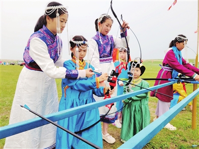 晚报小记者在贡格尔草原学习射箭。张译心 摄