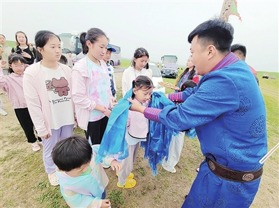 第三天,小记者们前往中国最大的天鹅湖之一——达里诺尔湖、达里诺尔自然博物馆、白音敖包国家级自然保护区沙地云杉林,了解草原英雄巴特尔成长之路,以及蒙古族习俗,在草原专属牧场体验现代牧民生活,在世界上仅存的一片沙地云杉林里亲手种下云杉树,参加环保小卫士活动。贡格尔草原民俗体验项目丰富多彩,包含蒙古族隆重的迎接贵宾仪式——迎宾酒和哈达祝福礼,彩虹小火车巡游草原,蒙古男儿三艺之射箭,精美民族服饰打卡,品尝蒙古额吉现场熬制的奶茶,观看博克比赛并参与互动,以及呼麦、马头琴等民族特色演出。