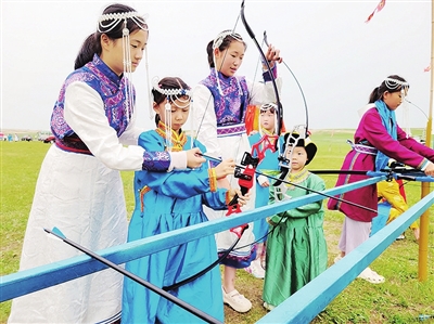 晚报小记者在贡格尔草原学习射箭。张译心 摄
