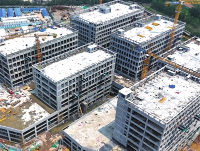大健康产业园片区美青工业园一期全部楼座主体封顶。