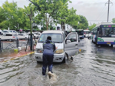 16日12时许,公交市北公司工作人员邵卡龙在郑州路重庆南路积水路段指引车辆通行,一辆银灰色面包车突然“趴窝”,见状他立即招呼同事一同上前帮忙,合力帮助车主将车辆推到路边安全地带。
