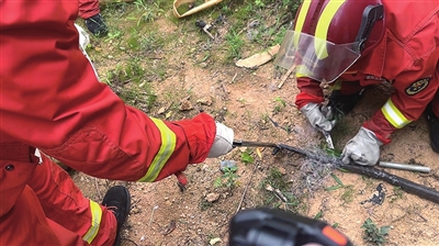 救援人员在现场发现,一条约1.5米长的赤峰锦蛇被鸡窝里的渔网缠住。救援人员利用捕蛇夹固定住蛇的头部,用刀子将渔网剪开。10多分钟后,赤峰锦蛇脱困,救援人员将其装入袋子中,带到野外放生。