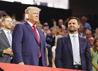 15日,在美国密尔沃基,特朗普(前左)和万斯出席共和党全国代表大会。新华社发