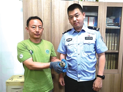 棘洪滩派出所民警将小鸟移交城阳野生动物保护协会工作人员。