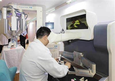 在上海交通大学医学院附属瑞金医院肿瘤质子中心,工作人员演示使用手术机器人剥蛋壳。 新华社发