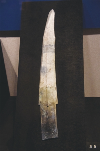 这是在四川省广汉市拍摄的三星堆遗址发掘区出土的玉戈。