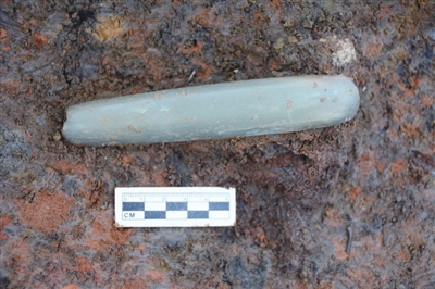这是2023年4月24日拍摄的四川省广汉市三星堆遗址发掘区出土的玉凿。