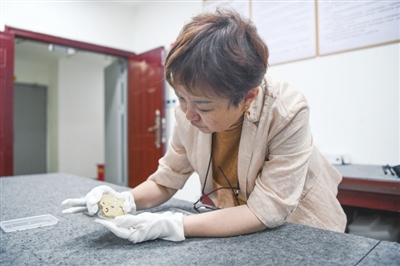 成都金沙遗址博物馆副馆长、中国文物学会玉器专业委员会副主任王方在鉴赏玉石上阳刻的侧身人像(2024年7月10日摄)。