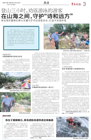 返岭、黄山、青山……一个个依山傍海的村落,犹如一颗颗珍珠散落在黄海之滨的崂山东麓。这里有茶田、沙滩、民宿,在远离城市喧嚣的角落里散发着独特的魅力。青岛市公安局海岸警察支队返岭派出所位于崂山风景区内,以景区警务、景区救援、沿海一线安全防范为工作重点,打造平安警区。今年夏天,岛城经历了多轮降雨,在浪漫温馨、魅力无限的海边,如何确保游客和市民的安全,成为了他们的重要任务。7月下旬,记者跟随返岭派出所民警巡逻,看他们在山海之间守护安全。