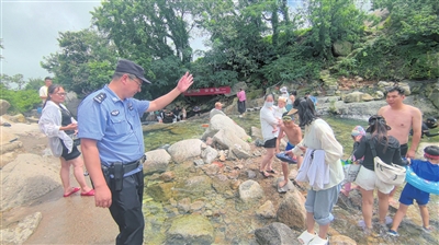 民警告诉记者,崂山东麓和其他景区相比,这里有海边木栈道、最美渔村、农家宴和各式各样的民宿,旅游度假的“自选动作”特别多,因此,很多市民和游客慕名自驾进山。“这是谁的孩子?家长呢?”民警发现水中几名套着游泳圈的孩子身边没有大人,立刻开始询问。因为人声嘈杂加上尖锐的蝉鸣声,民警不得不提高嗓门。大约1分钟后,一名女子匆匆赶到,说这是她和亲戚带来的孩子。“即便是有游泳圈,也不要让孩子离开你的视线!”民警提醒女子和现场其他家长,山涧水特别清凉,不仅要防止儿童溺水,更要防止可能出现的身体不适。